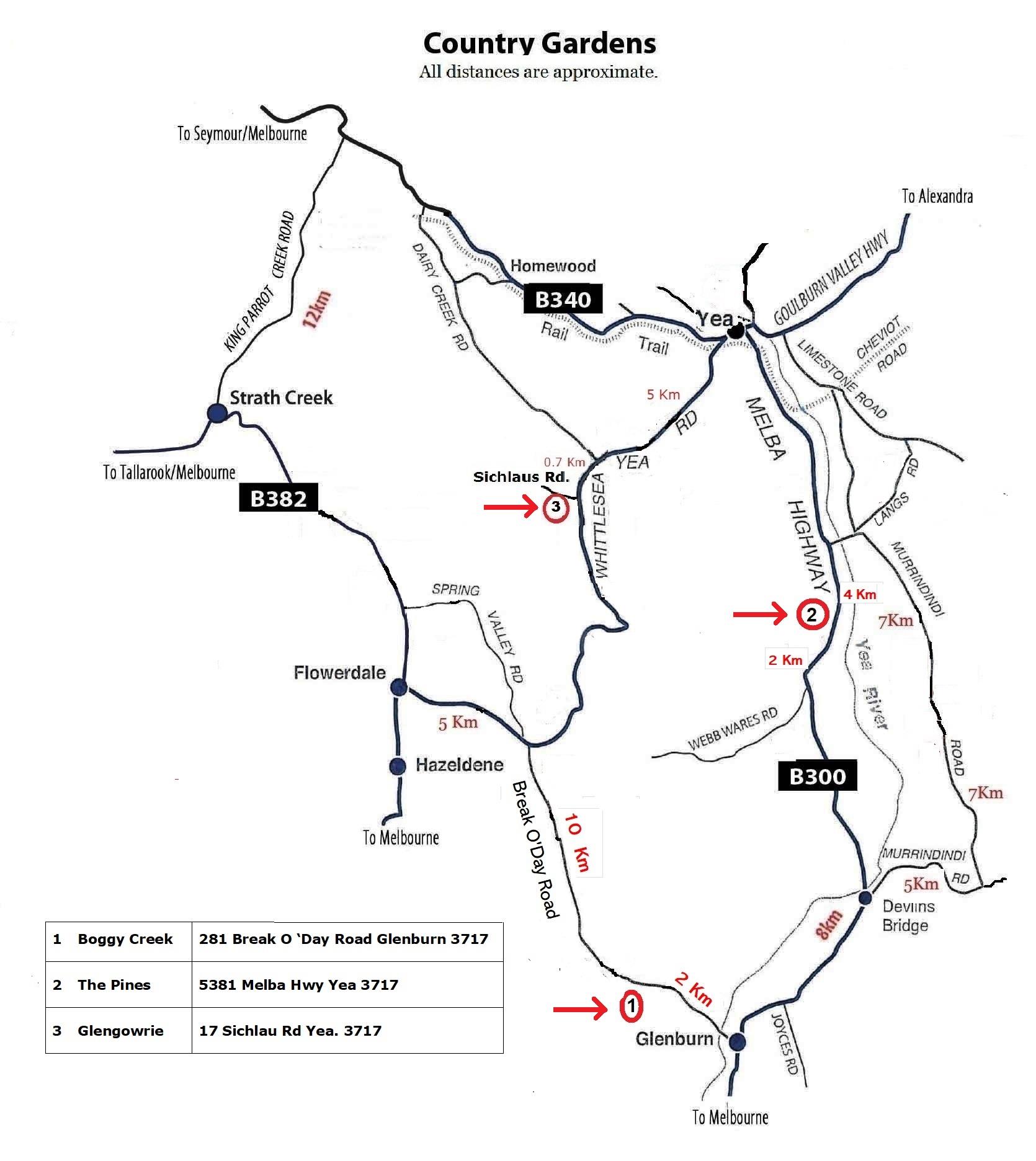 Cash only at The Pines and Glengowrie - EFT available at Boggy Creek and the BBQPrint Country Gardens Map