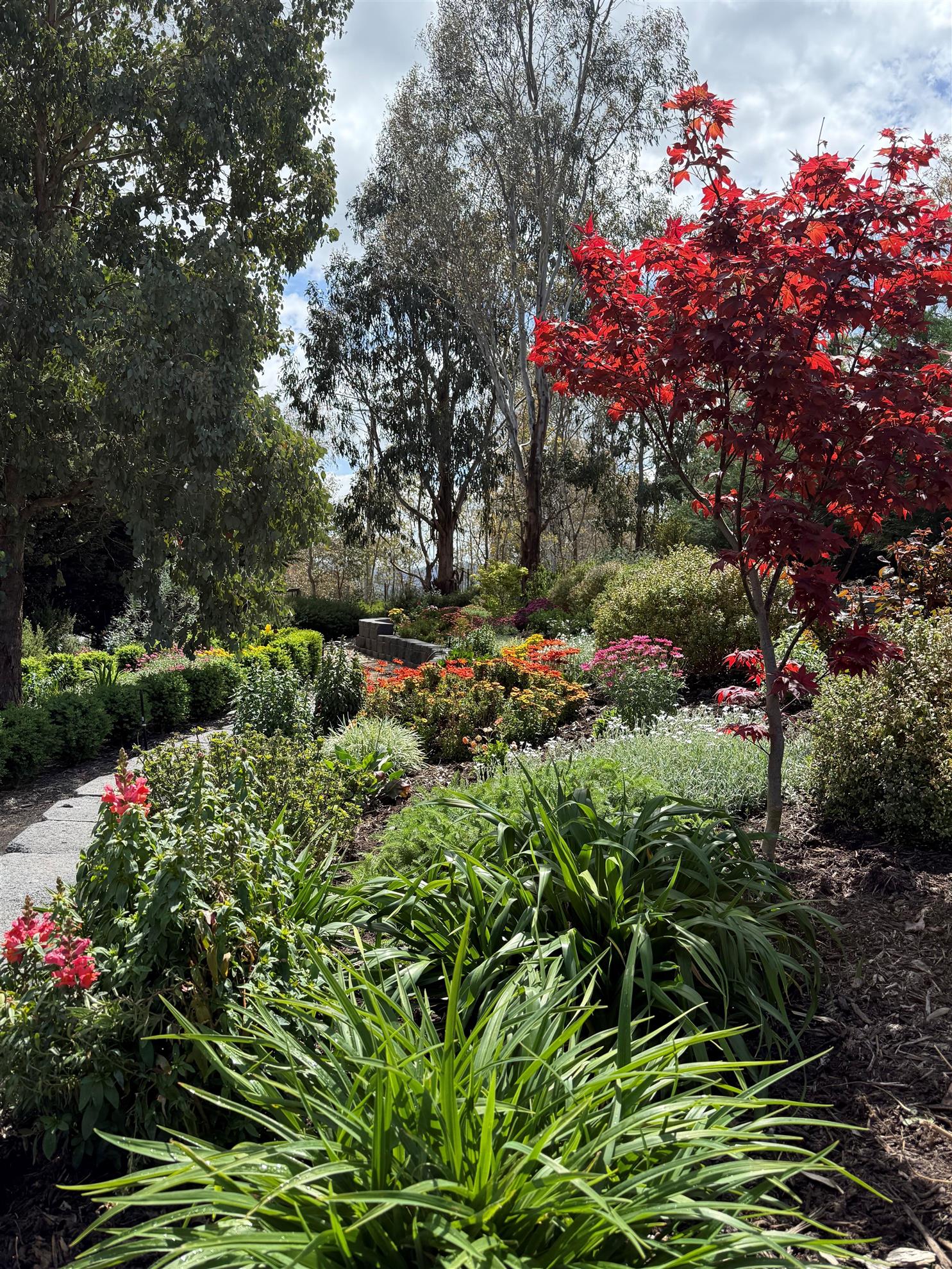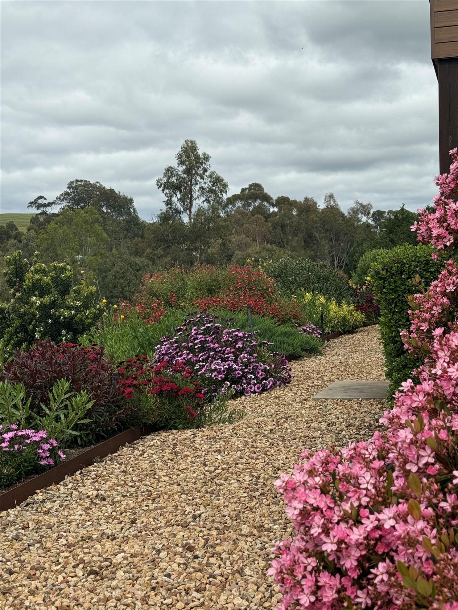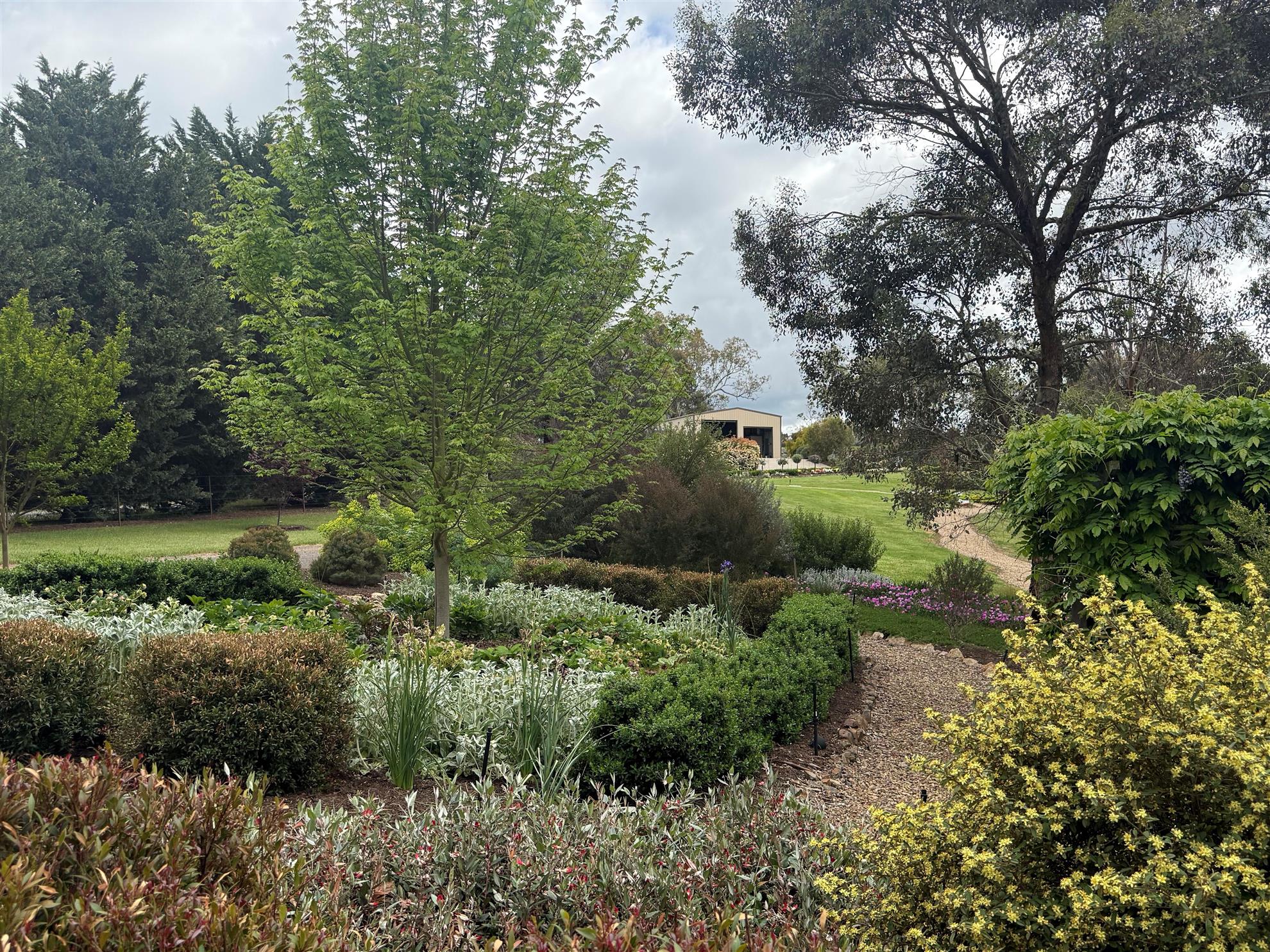 The Jarvis Garden is situated on a 10 acre property close to the Yea and is just 5 years in the making. A series of pathways lead you around sloping terrain through a variety of developed gardens. Along the way there are several opportunities to sit and absorb the views of the rolling farmland hills. Due to the harsh southerly winds that occur frequently two larger gardens have been planted predominantly with native varieties of grasses, ground covers and lower growing shrubs. Other smaller gardens have a blend of plants from around the world. A planted avenue of deciduous trees on the lower level takes you to the gardens closer to the dam. Stuart’s design experience is evident throughout this garden.